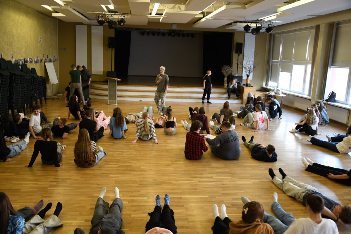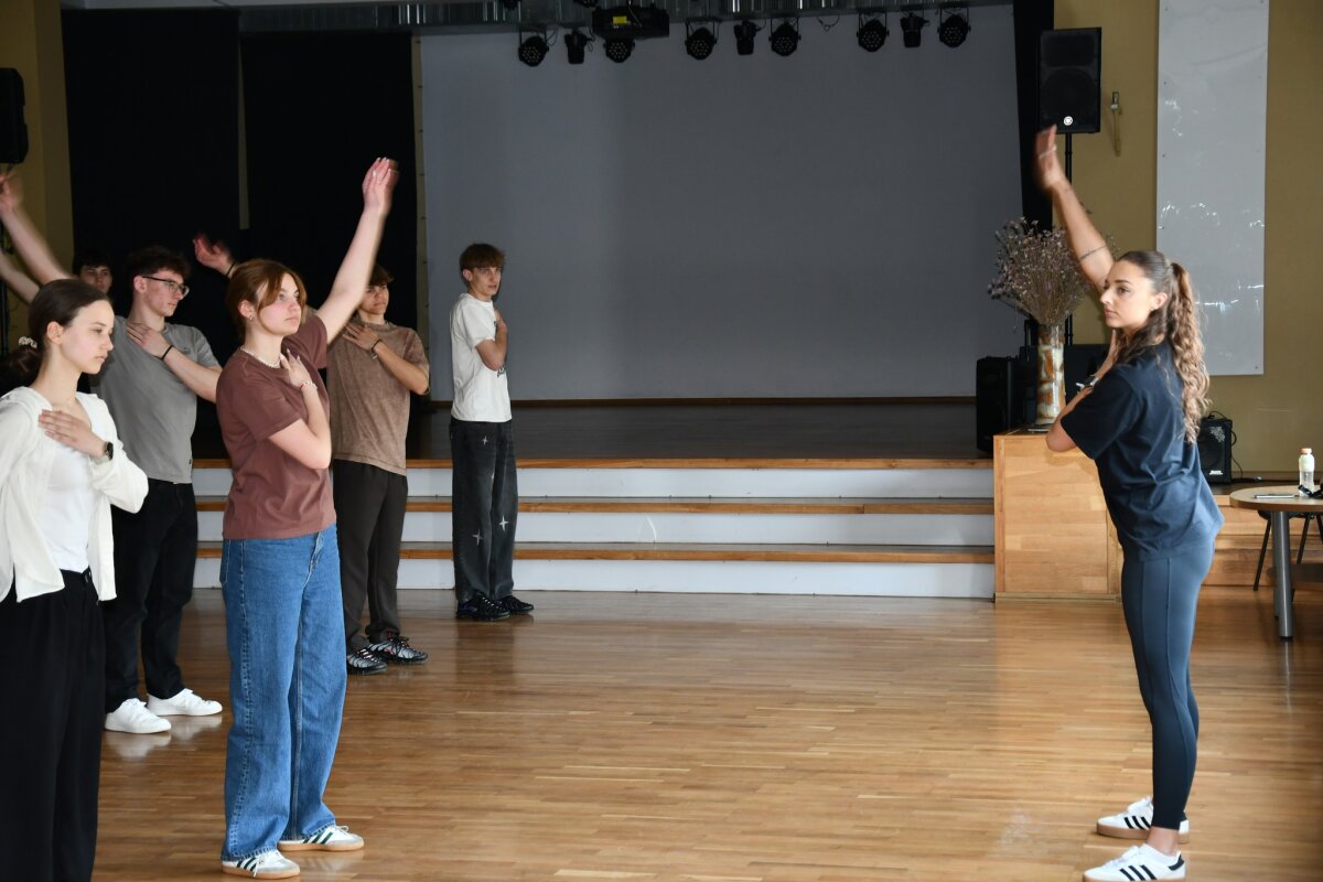 Judesio, ritmo ir erdvės pajautą mokiniai lavina su Dominyka Vosyliūte, kurios užsiėmimuose gilinamasi į kvėpavimo technikas, kūno kalbos galią ir organišką judėjimą scenoje.