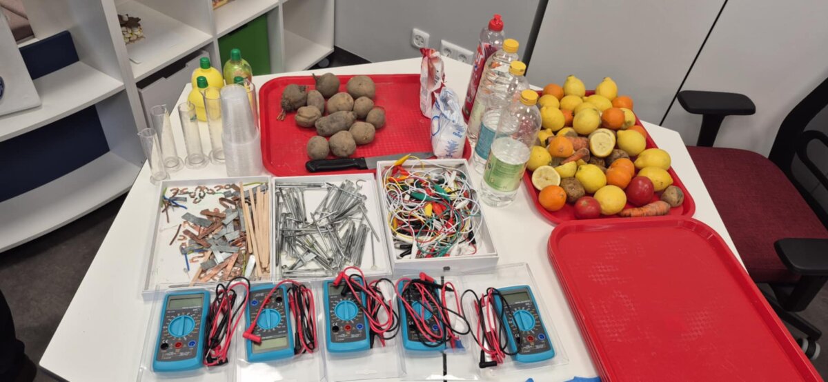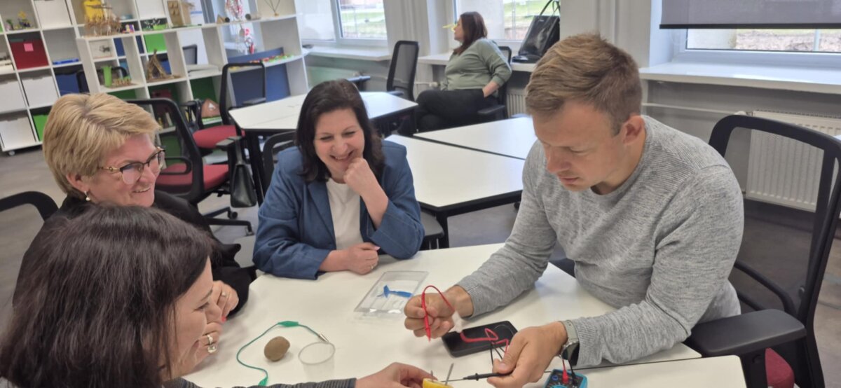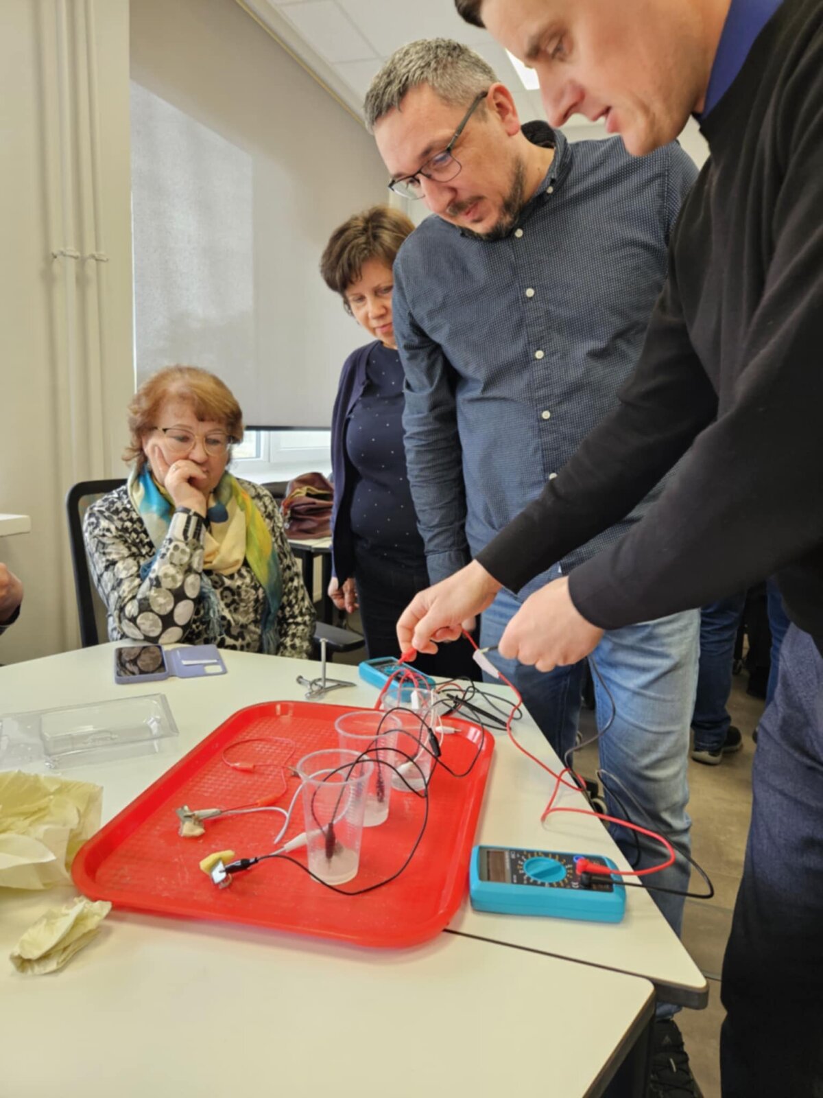 Kitoje praktinėje veikloje – „Energija iš gamtos“ mokytojai komandose kūrė paprastą, bet efektyvų energijos šaltinį, galintį sugeneruoti 1,5 V elektros. Spręsdami inžinerinius iššūkius, dalyviai lavino problemų sprendimo, inžinerinį mąstymą, kūrybiškumą ir komandinio darbo įgūdžius.