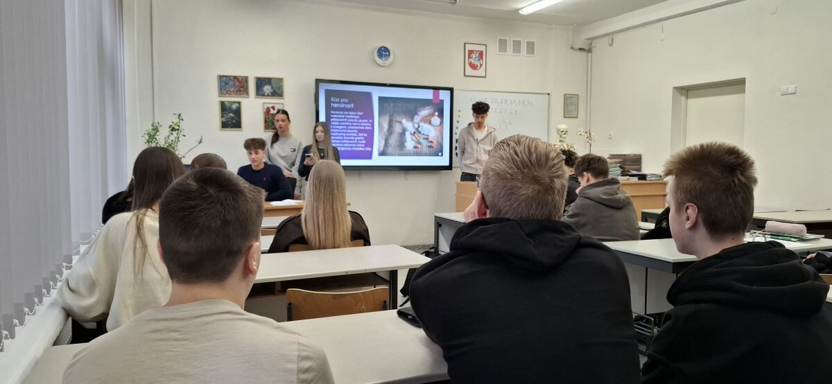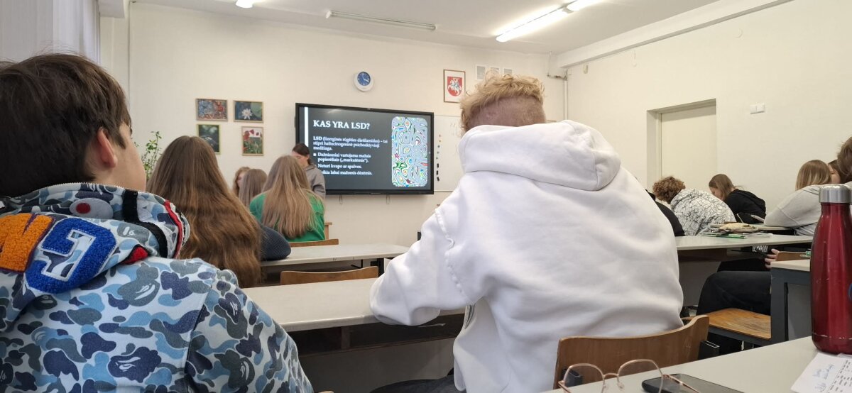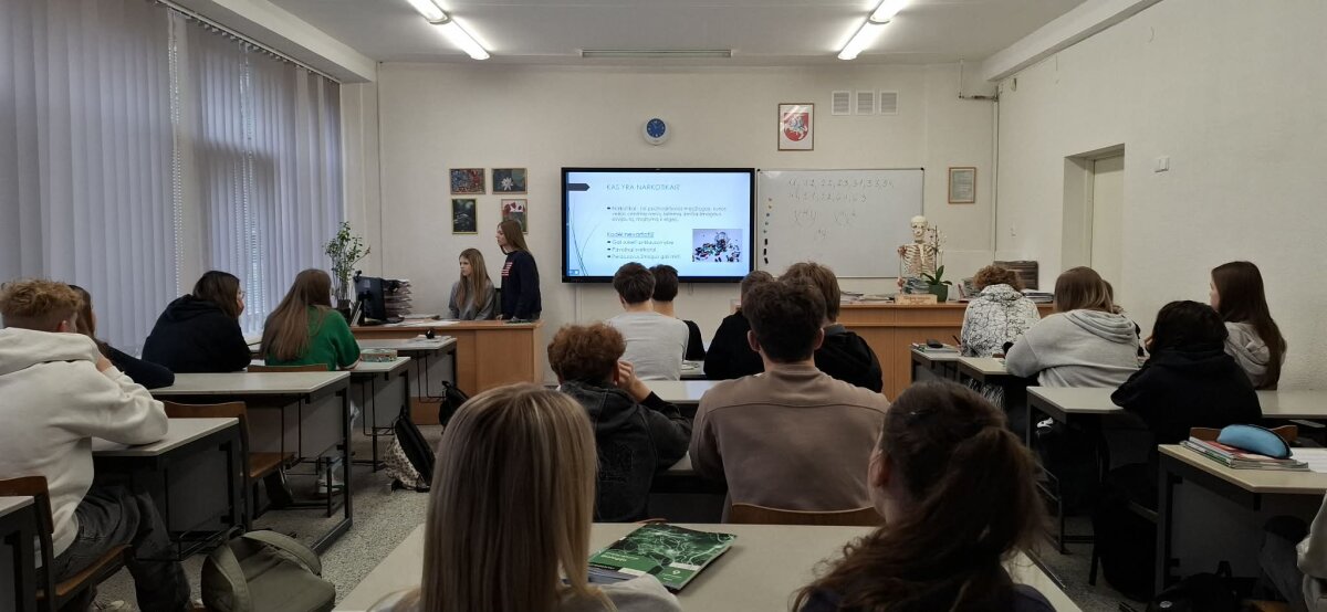 Marijampolės Sūduvos gimnazijoje vyko integruotos I klasių mokiniams pamokos, kurių tikslas – didinti jaunimo supratimą apie psichoaktyvių medžiagų žalą ir taip stiprinti atsakomybę už savo sveikatą bei ugdyti gebėjimą priimti saugius ir atsakingus sprendimus.