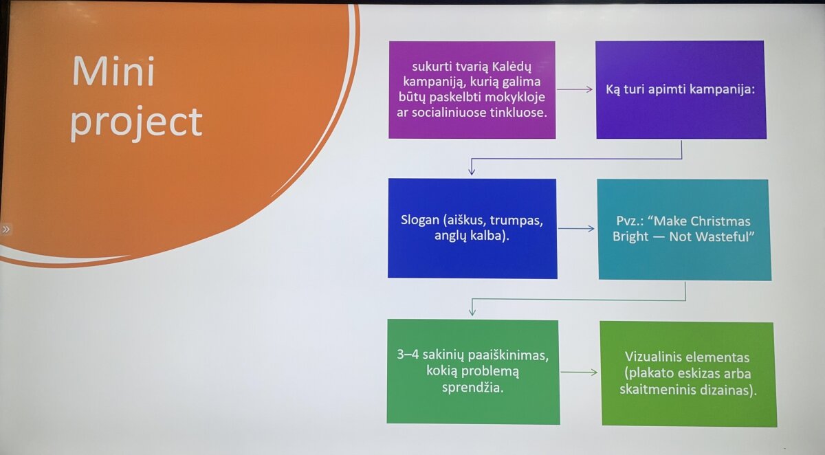 IIKTU klasės mokiniai gilinosi į tvaraus vartojimo idėjas ir kartu mokėsi apie jas argumentuotai kalbėti anglų kalba. Mokiniai nagrinėjo, kaip kurti atsakingas Kalėdas, kokios tvarios verslo idėjos galėtų būti naudingos bendruomenėms, bei kaip sąmoningas vartojimas prisideda prie aplinkos saugojimo. Dirbdami grupėse, jie kūrė tvarių dovanų prototipus ir pristatė jų ekonominę bei socialinę vertę.