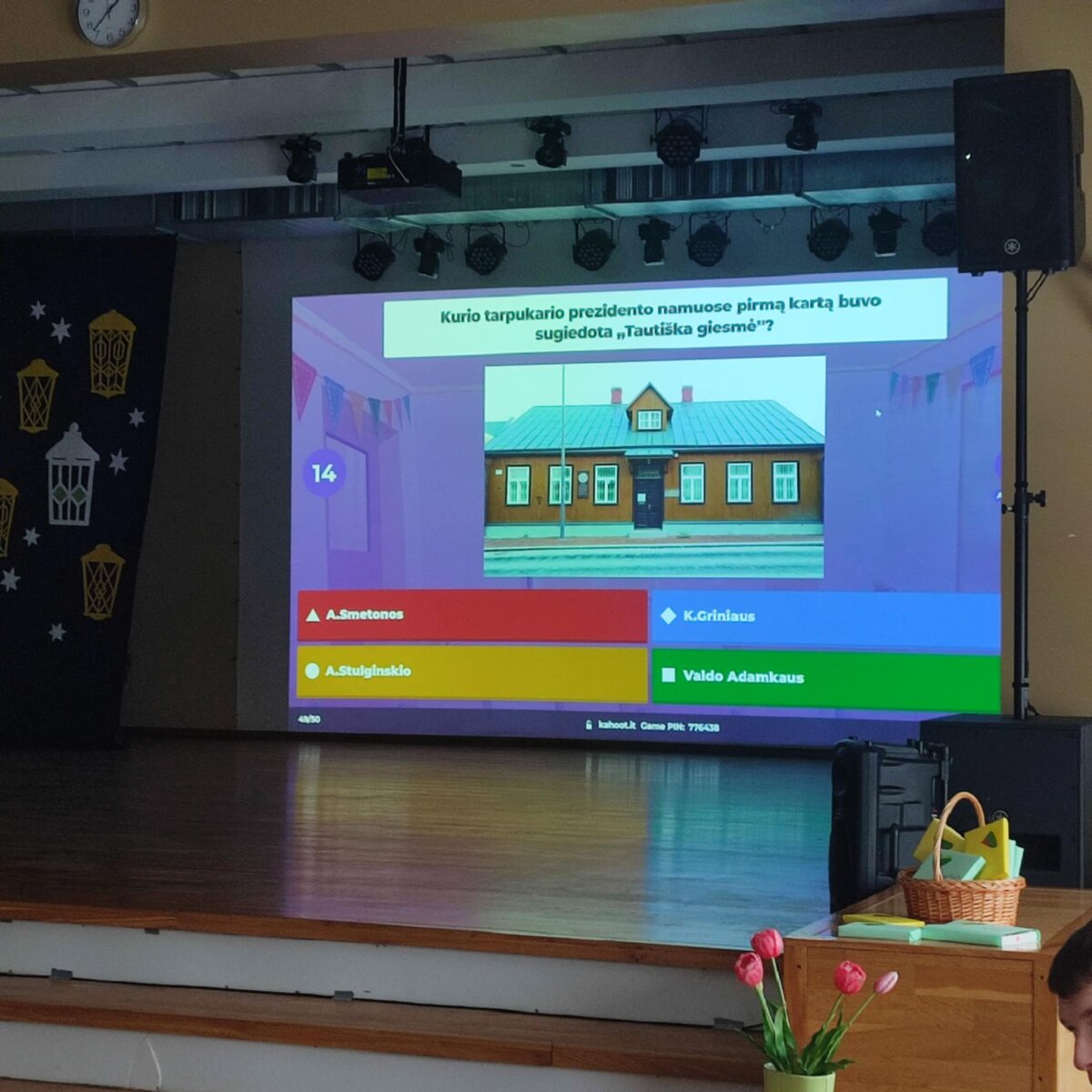 Vasario 11 dieną I–IV gimnazijos klasių mokiniai dalyvavo Nacionaliniame konkurse „Lietuvos istorijos žinovas“. Jie atliko konkurso užduotis ir pasitikrino savo žinias apie Lietuvos praeitį. Nacionalinio konkurso tikslas – skatinti kiekvieną Lietuvos pilietį nuolat domėtis savo šalies istorija, stiprinti tapatumo jausmą su valstybe, ugdyti bendruomeniškumą, patriotizmą bei puoselėti pasididžiavimą Lietuvos istorija.