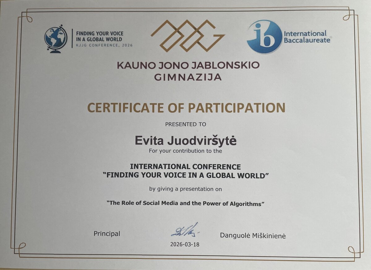 IVB klasės mokinės Esma Akbana ir Evita Juodviršytė kovo 18 dieną dalyvavo tarptautinėje konferencijoje–edukacinėje pamokoje „Finding Your Voice in a Global World“. Šis renginys subūrė mokinius iš kelių šalių dalintis idėjomis, stiprinti viešojo kalbėjimo įgūdžius bei gilinti supratimą apie globalius procesus.