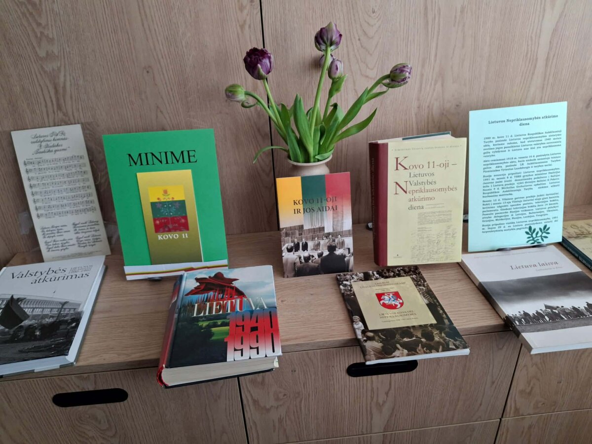 Minint Kovo 11-ąją, gimnazijos bibliotekoje taip pat buvo parengta leidinių ekspozicija „Minime Kovo 11-ąją“, kvietusi mokinius ir mokytojus prisiminti Lietuvos nepriklausomybės atkūrimo istoriją, svarbiausius įvykius bei asmenybes.