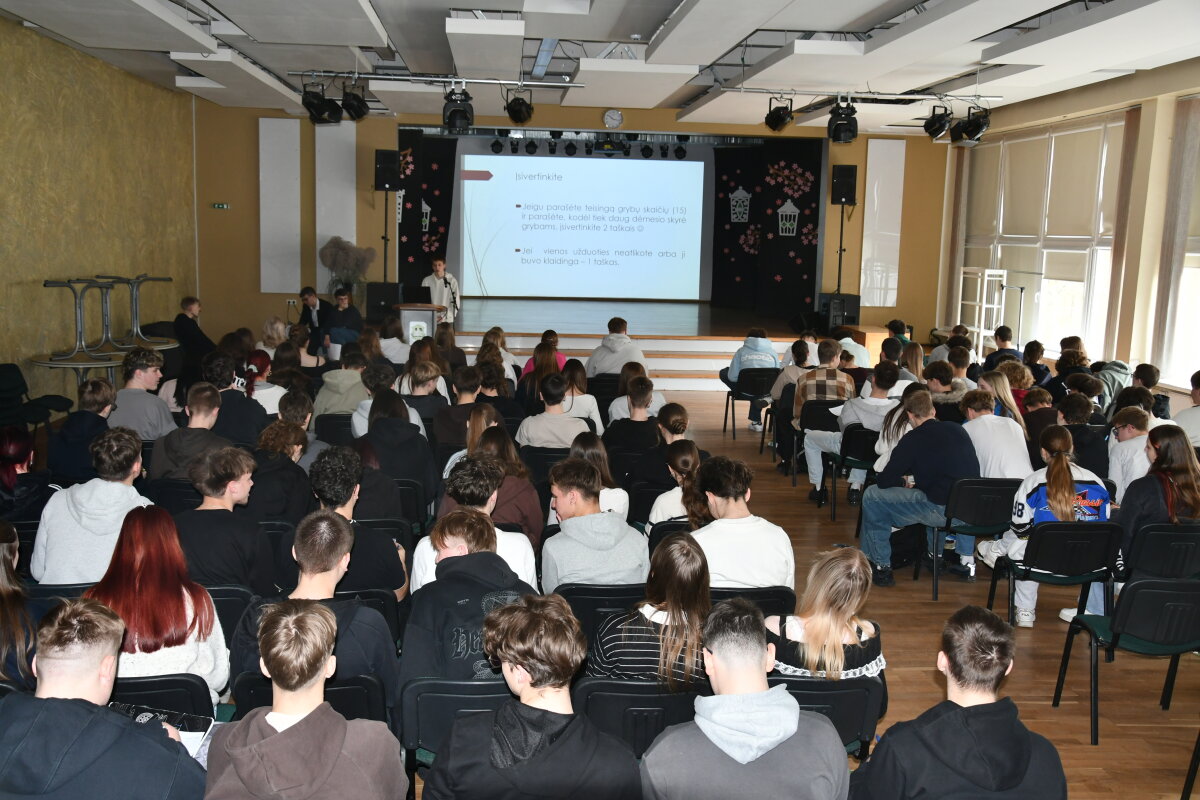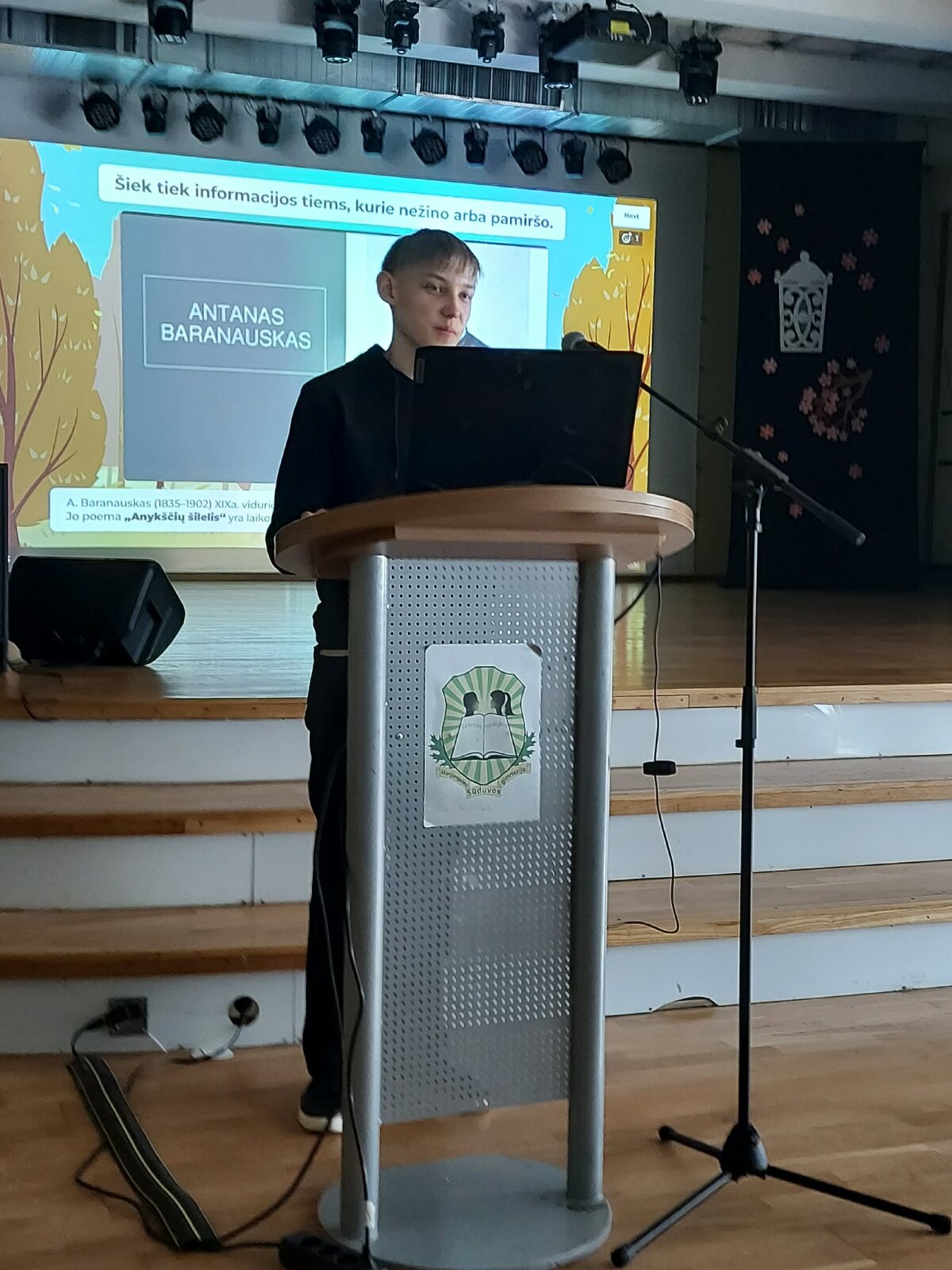 Balandžio 9 dieną gimnazijos renginių salėje įvyko integruota lietuvių kalbos, informatikos ir menų pamoka „Anykščių šilelis gimnazistų akimis“. Pamoka be mokytojų. Atrodė, kad taip negali būti, bet įsitikinome – gali. Mes, devyni gimnazistai, pristatėme filmuką apie A. Baranauską, pateiktis apie poemą „Anykščių šilelis“ su užduotimis, mokinių kūrybinį darbą (mūsų padarytas nuotraukas ir eiliuotą tekstą pagal jas), parengėme žaidimą „Kahoot“. Visą pamoką dalyviai (šešių klasių mokiniai) noriai atliko užduotis.